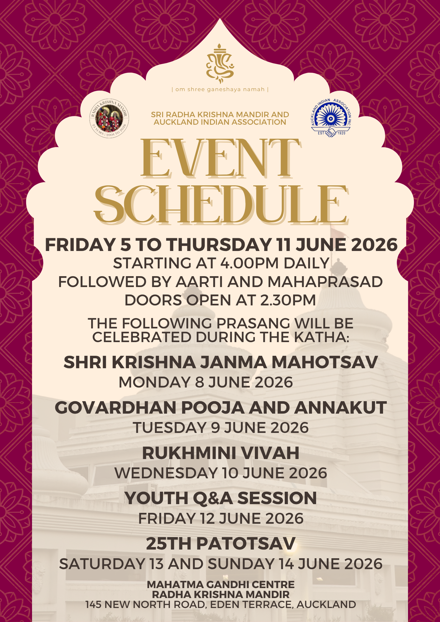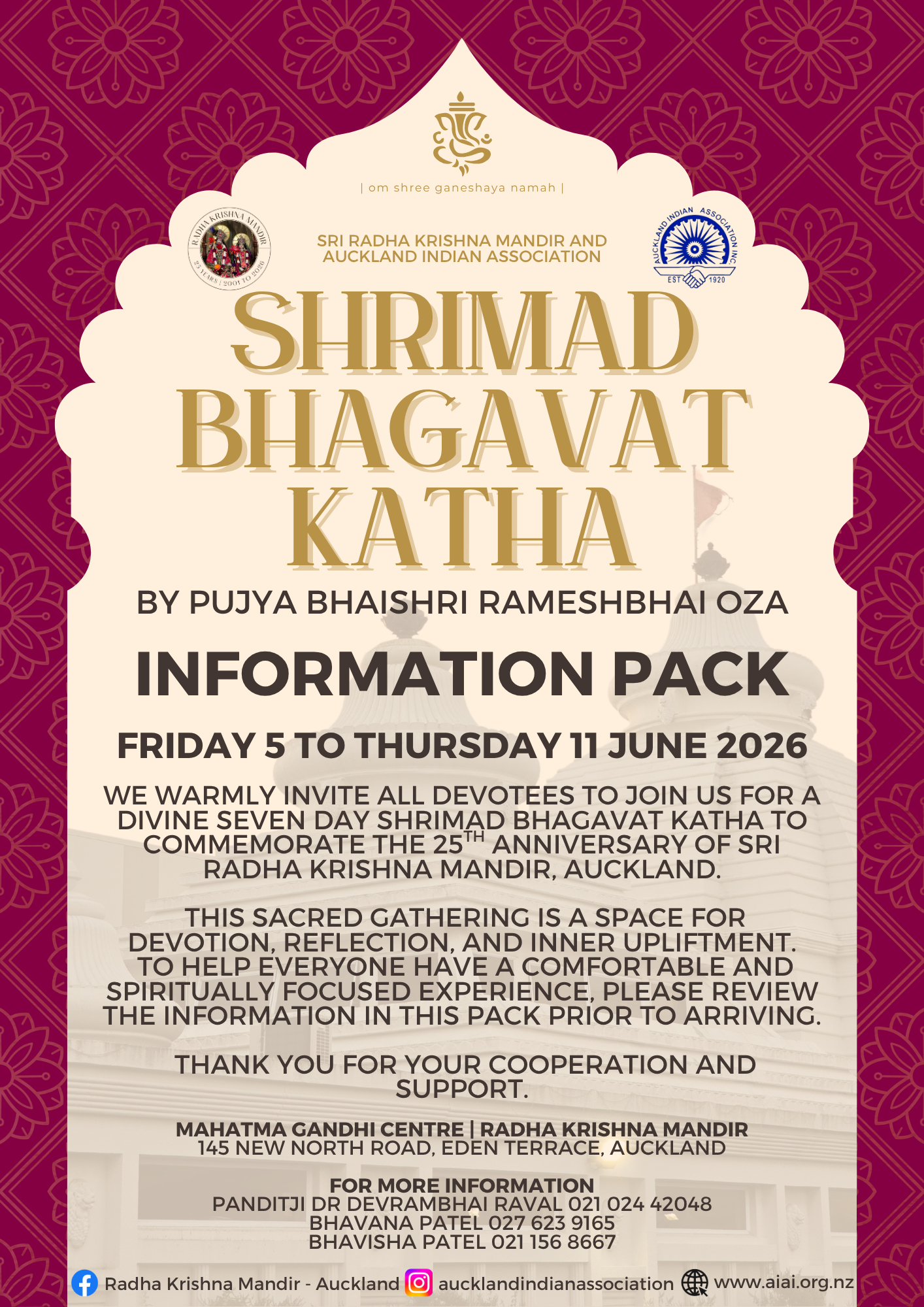 Watch Our StoryRadha Krishna Mandir invite you all to our Shrimad Bhagavat Katha in Hindi by Pujya Bhaishri Rameshbhai Oza from Friday 5th to Thursday 11th June 2026 followed by 25th Patotsav on Saturday 13th...