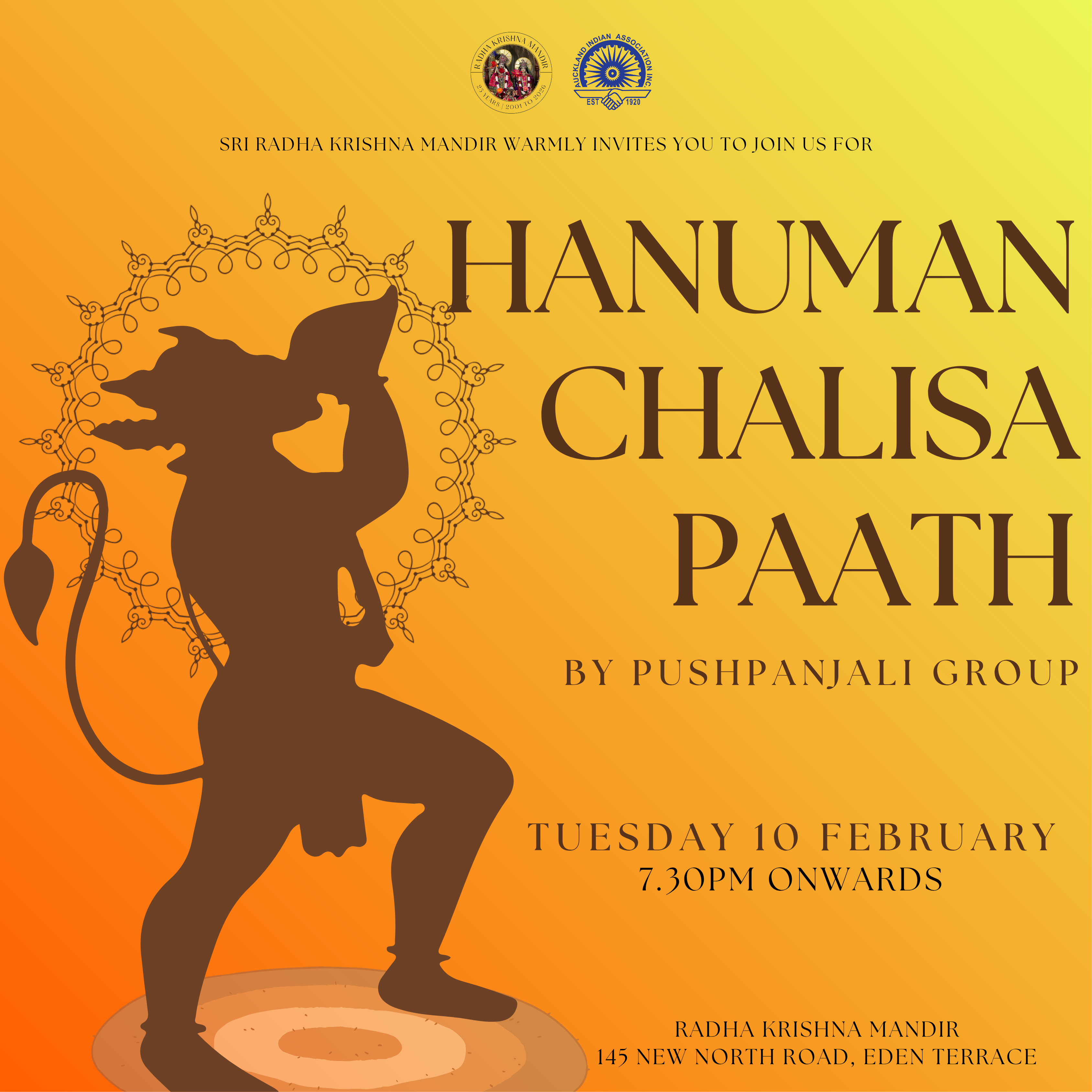 Join us for a soul-enriching evening of devotion and chanting as we come together for the Hanuman Chalisa Paath by the Pushpanjali Group ππ½π